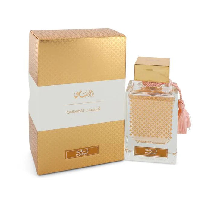 Rasasi Qasamat Morhaf is a vibrant and sophisticated men’s fragrance that blends freshness with oriental elegance. Opening with crisp citrus and aromatic top notes, it develops into a heart of warm spices and florals, and finally settles into a base of musk, amber, and soft woods. Perfect for the confident man, it delivers long-lasting wear and a memorable presence.